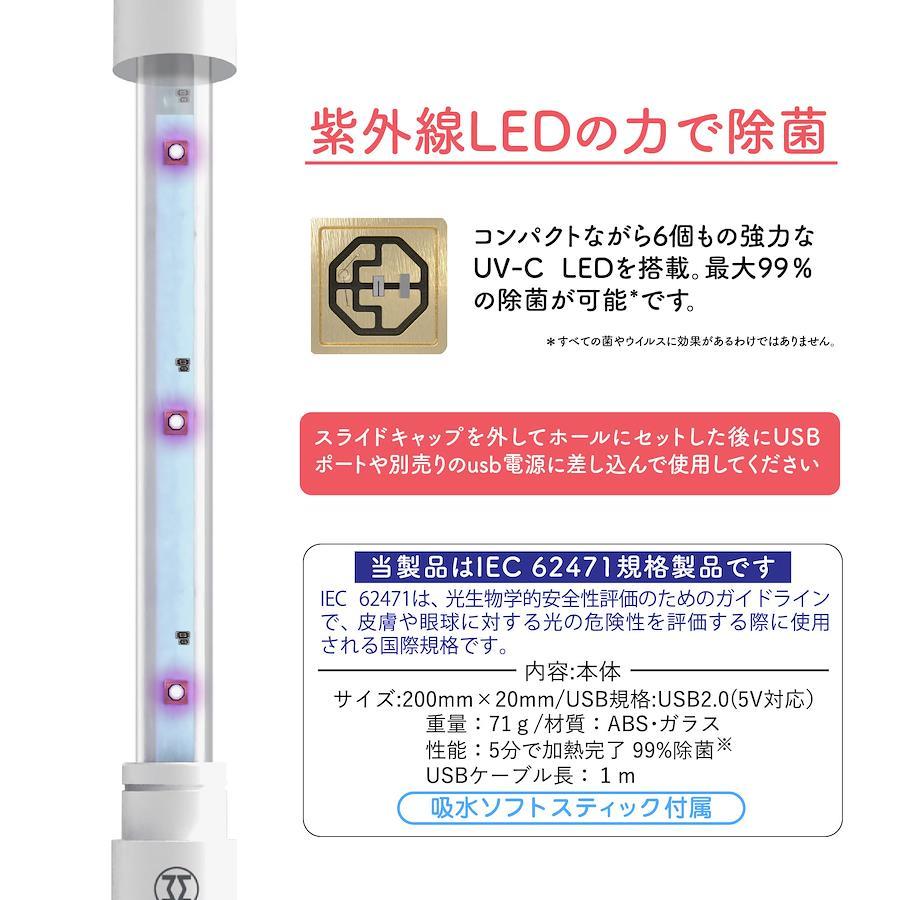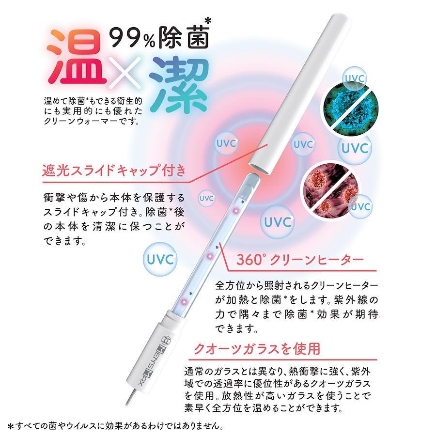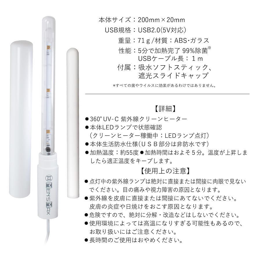 メンズマックス 360UV ウォーマープロ商品説明【99.9%除菌】除菌に最も効果的な波長275nmのUVC紫外線ランプを6個搭載し、USB電源を入れるだけで99.9%除菌ができる。気になるウイルスや、細菌をしっかり除菌してくれて、お気に入りのホール内を360度清潔に保てます。■使い方手順①本体キャップを外す②ウォーマーをホールにセットする③USB電源をセットして加熱と、除菌を開始します【ロングサイズ】本体サイズは20cmで大型ホールの使用も安心です【液体に強い 生活防水仕様】材質はABS・ガラスなので安心の生活防水仕様。丸洗いができるので清潔に使用できます。※USB部分は非防水です。【商品サイズ】全長:200 直径:20(単位:mm)【内容量】71g【ウォーマー機能】加熱時間およそ5分で約55度まで上がり加熱完了。【使用上の注意】●点灯中の紫外線クリーンランプは絶対に直接または間接に肉眼で見ないでください。目の痛みや視力障害の原因となります。●紫外線を皮膚に直接または間接にあてないでください。皮膚の炎症や日焼けをおこす原因となります。 【99.9%除菌】除菌に最も効果的な波長275nmのUVC紫外線ランプを6個搭載し、USB電源を入れるだけで99.9%除菌ができる。気になるウイルスや、細菌をしっかり除菌してくれて、お気に入りのホール内を360度清潔に保てます。■使い方手順①本体キャップを外す②ウォーマーをホールにセットする③USB電源をセットして加熱と、除菌を開始します 【ロングサイズ】本体サイズは20cmで大型ホールの使用も安心です 【液体に強い 生活防水仕様】材質はABS・ガラスなので安心の生活防水仕様。丸洗いができるので清潔に使用できます。※USB部分は非防水です。 【商品サイズ】全長:200 直径:20(単位:mm)【内容量】71g 【ウォーマー機能】加熱時間およそ5分で約55度まで上がり加熱完了。