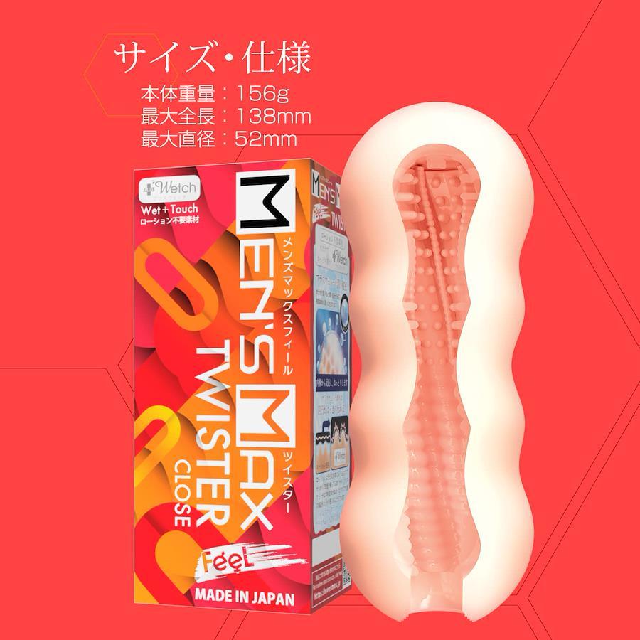 【MEN'S MAX FEEL TWISTER CLOSE商品説明】特徴的な形状フィールシェイプは自然で安定した握り心地を実現。【原産国】日本【本体商品サイズ】高さ138mm幅52mm奥行52mm【仕様】非貫通タイプ【内容量】156g【ローション不要素材プラスウェッチ】水をかけるだけでねっとり濡れる、ローション不要の特許技術です。ご家庭にある水で即座に使え、使用後は洗って乾燥させれば複数回までお使いいただけます。【プラスウェッチが潤う秘密】水分が付着すると潤い成分が反応し樹脂本体が潤いに包まれます。【プラスウェッチ素材は凹凸がはっきり伝わる!】ローションは凹凸の隙間に入り込むのでせっかくの快感が鈍ってしまいがち。プラスウェッチは素材自体がぬめりだすので内部の構造をはっきり感じることができます。【MEN'S MAX FEEL TWISTER CLOSE内部構造】ボリュームのある突起がうねるように回転して広範囲を複雑に刺激。シンプルながらしっかり刺激するツイスト構造。【メンズマックスフィールご使用方法】①用意する物は「水」のみ。内部を水で軽く濡らします。溢れるまで水を入れ過ぎないようご注意ください。②揉んで潤う、沁み出す。本体を揉み込み、内部から潤いゼリーが出てきたら準備完了です。③洗浄後も複数回ご使用OK!洗浄の際は、適度に洗った後乾いた布などで水分を拭き取ってください。再度水で濡らすことで複数回ご使用いただけます。※ぬめりが弱いと感じる場合は付属のポケットローションをご利用ください。 【原産国】日本 【本体商品サイズ】 高さ138mm幅52mm奥行52mm【仕様】非貫通タイプ 【内容量】156g 【ローション不要素材プラスウェッチ】水をかけるだけでねっとり濡れる、ローション不要の特許技術です。ご家庭にある水で即座に使え、使用後は洗って乾燥させれば複数回までお使いいただけます。 【MEN'S MAX FEEL TWISTER CLOSE内部構造】ボリュームのある突起がうねるように回転して広範囲を複雑に刺激。シンプルながらしっかり刺激するツイスト構造。