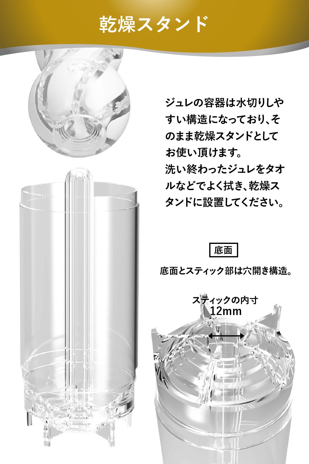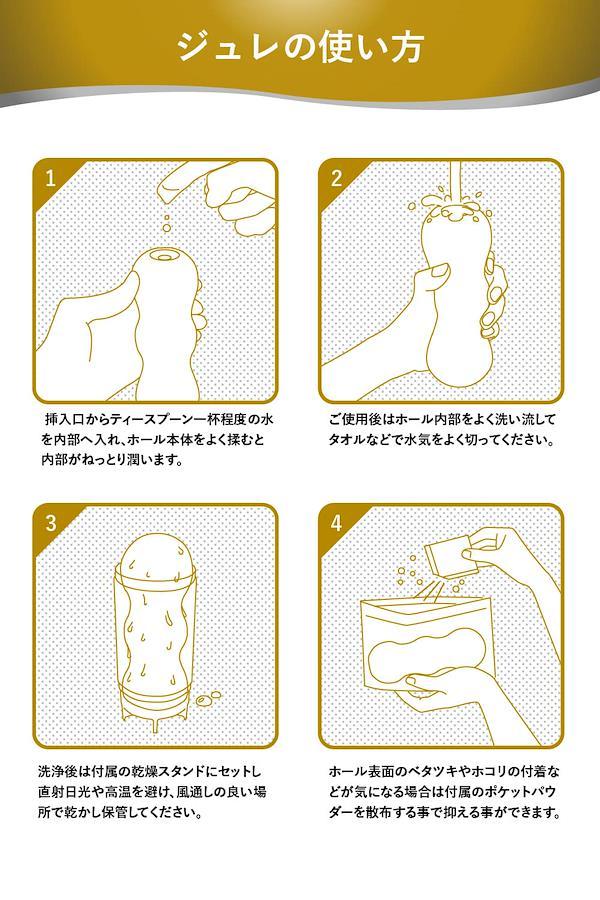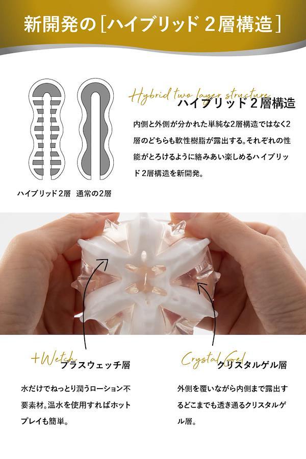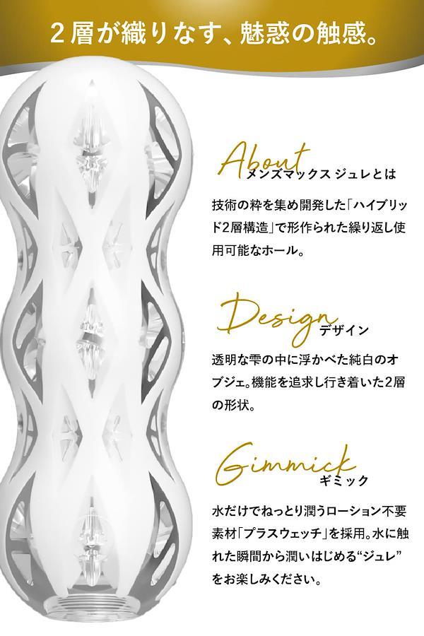 メンズマックス ジュレ(gelee)。独自素材「プラスウェッチ」の良さを最大限に引き出すために、追求し生まれたのがハイブリット2層ホール「ジュレ(gelee)」です。「プラスウェッチ」は、ゲル表面に水分が付着することでゲル本体が本物のような滑りを染みだすためローションでは鈍ってしまう内部の細かい造形1つ1つの刺激をしっかり体感することができます。この「プラスウェッチ」を透明度が高く耐久性に優れた「クリスタル・ゲル」で包み込むことで「プラスウェッチ」本来の特性がより引き出され、今までに感じたことのない体験ができるようになりました。ハイブリット2層の成形技術は、丸2年もの時間をかけ完成した特許技術です。(出願中)古き日本伝統のガラス細工のような美しいデザインは見る者を魅了し、その細工はジュレ内部の形状を表現しています。そして、この特性のちがう2種のゲルが生み出す快感はメンズマックス・ジュレだけです。【ジュレカラットの内部構造】カラットポリッシャー(クリスタルゲル層)研磨機の様なギザギザ構造がシンプルながらやみつき。カラットピラミッド(プラスウェッチ層)光り輝く大粒のダイヤの様なギミックが攻め立てる。専用のハードケースはメンテナンス後の保管に優れており、ケース中央に伸びたスティックはジュレ内部への通気性を高めより清潔に保つことができます。使用後にはジュレ本体に付属のポケットパウダーを塗布することで、人肌のようにサラッとした触感にすることも出来ます。※ 一度ポケットパウダーを塗布するとジュレ表面の透明度は無くなります。)未だ見たことも感じたこともない体験を。【メンズマックスジュレご使用方法】1挿入口からティースプーン一杯程度の水を内部へ入れ、ホール本体をよく揉むと内部がねっとり潤います。2ご使用後はホール内部をよく洗い流してタオルなどで水気をよく切ってください。3洗浄後は付属の乾燥スタンドにセットし直射日光や高温を避け、風通しの良い場所で乾かし保管してください。4ホール表面のベタツキやホコリの付着などが気になる場合は付属のポケットパウダーを散布する事で抑える事ができます。*電池駆動製品ではございません。 【原産国】日本(JAPAN) 【メンズマックスジュレとは】技術の粋を集め開発した「ハイブリット2層構造」で作られた繰り返し使用可能なオナホール。【デザイン】透明な雫の中に浮かべた純白のオブジェ。機能を追求し行き着いた2層の形状。【ギミック】水だけでねっとり潤うローション不要素材「プラスウェッチ」を採用。水に触れた瞬間から潤いはじめるジュレをお楽しみください。 【新開発のハイブリッド2層構造】内側と外側が分かれた単純な2層構造ではなく2層のどちらも軟性樹脂が露出する。それぞれの性能がとろけるように絡みあい楽しめるハイブリッド2層構造を新開発。【プラスウェッチ層】水だけでねっとり潤うローション不要素材。温水を使用すればホットプレイも簡単。【クリスタルゲル層】外側を覆いながら内側まで露出するどこまでも透き通るクリスタルゲル層。 【乾燥スタンド】ジュレの容器は水切りしやすい構造になっており、そのまま乾燥スタンドとしてお使い頂けます。洗い終わったジュレをタオルなどでよく拭き、乾燥スタンドに設置してください。【繰り返し使用可能】使用後は水・またはぬるま湯で洗い流してください。洗い終わったあとは付属の乾燥スタンドに設置し、直射日光や高温を避け、風通しの良い場所に保管してください。 【ジュレカラットの内部構造】カラットポリッシャー(クリスタルゲル層)研磨機の様なギザギザ構造がシンプルながらやみつき。カラットピラミッド(プラスウェッチ層)光り輝く大粒のダイヤの様なギミックが攻め立てる。