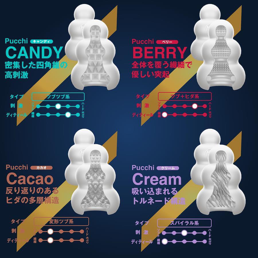 【メンズマックスプッチプレミアム12種セット】水をかけるだけで贅沢にねっとり。従来のプッチから潤い成分「プラスウェッチ」から60%増量(当社比)。さらに使用する軟性樹脂をより滑らかな肌触りのいいものへ昇華させ、まさにプレミアム品質に仕上げました。【ローション不要。必要なのは水だけ】ローション不要軟性素材「プラスウェッチ」水分が付着すると潤い成分が反応、ねっとりした潤いに包まれます。【内容量】ホール12個(ウェーブ:35g、ドット:33g、シャワー:32g、コンボ:35g、ベリー:34g、カカオ:34g、クリーム:36g、キャンディー:33g、クリオネ:35g、スクイッド:35g、オクトパス:36g、ジェリーフィッシュ:35g)【ウェーブ内部構造】「連続で打ち寄せる刺激の波」ウェーブ状のヒダが絶え間なく打ち寄せる刺激の波をもたらす【ドット内部構造】「細かなイボの精細な刺激」無数に配置されたツブツブ突起が全体を繊細に刺激する【シャワー内部構造】「優しく降り注ぐまったりヒダ」まったりと撫で付けるヒダは優しく降り注ぐシャワーのように【コンボ内部構造】「リングとツブのメリハリ刺激」大型リングとツブが交互に迫り来る刺激のメリハリ連続攻撃【キャンディー内部構造】「密集した四角錐の高刺激」整然と敷き詰められた四角錘の突起【クリーム内部構造】「吸い込まれるトルネード構造」斜めに擦り上げてくるヒダはクリームのように昇りつめる絶頂感【ベリー内部構造】「全体を覆う繊細で優しい突起」フワフワとした起毛が包み込みまったりしたなめらかな触感【カカオ内部構造】「反り返りのあるヒダの多層構造」ビッシリ並んだヒダは反発しながら複雑に絡みつく刺激【クリオネ内部構造】「スジ・イボ・ヒダの多彩な刺激」大ぶりの突起たちが全体を大胆に刺激する【ジェリーフィッシュ内部構造】「動かすたびに突起が弾ける刺激」長めに作られた突起が全体を弾いて刺激する【オクトパス内部構造】「張り巡らされた吸盤が吸い付く」吸盤とイボが密着し刺激を生み出す【スクイッド内部構造】「突き上げるように延びた刺激ライン」大きく隆起をしたスリットが奥へ奥へといざなう【メンズマックスプッチご使用方法】1プッチ本体を取り出します。水に濡れた指で内側を軽くこすり、本体を揉んで十分に潤わせます。2挿入部から挿入すると、小さいのによく伸びる素材なので、どんな方でもピッタリフィットします。3使用後はメンテナンスをすることで繰り返しお使いいただけます。【メンズマックスプッチご使用上の注意】●直射日光を避けて保管してください。●お肌に異常が生じていないかよく注意して使用してください。●お肌に傷・湿疹等異常がある時は使用しないでください。●乳幼児の手の届かないところに保管してください。 【従来品から60%増量】従来品であるプッチシリーズから潤い成分が60%増量しました(当社比)。 【特許登録済独自素材を採用】プラスウェッチは独自開発の新素材。水をつけて軽く擦ることで、内部の超ミクロサイズで閉じ込められた「潤いゼリー」が水に反応し、沁みだし、樹脂表面をねっとりと潤い包みこみます。 【デコボコ感、さらにクッキリ。】新たに導入した「HD(High Definition)成形」で突起のデコボコ感がさらにクッキリになりました。突起に触れたときの粒立ちが違います。【弾力感、さらにモッチリ。】「HD 成形」により軟性樹脂の弾力性も向上。さらにモッチモチに、しなやかな素材になりました。 【商品サイズ】本体一個あたり: 70mm×50mm×35mm【内容量】ホール12個(ウェーブ:35g、ドット:33g、シャワー:32g、コンボ:35g、ベリー:34g、カカオ:34g、クリーム:36g、キャンディー:33g、クリオネ:35g、スクイッド:35g、オクトパス:36g、ジェリーフィッシュ:35g)