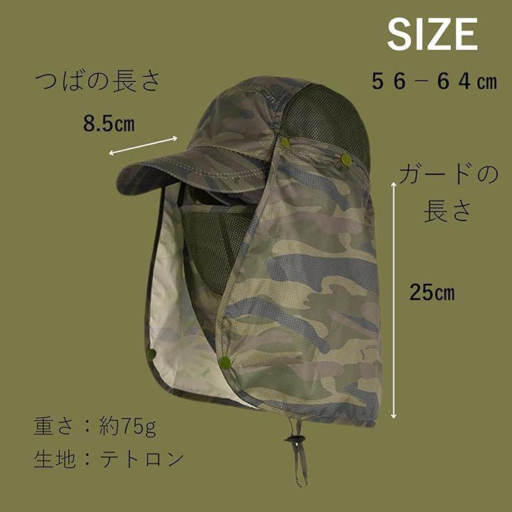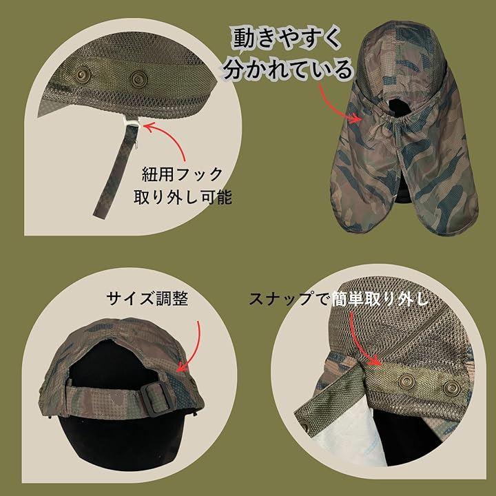 「顔・首をしっかりガード。快適メッシュ素材の作業用帽子」 このキャップは、取り外し可能なフェイスカバーとネックカバーが一体となったデザインで、顔全体から首までを紫外線から徹底的にガードします。