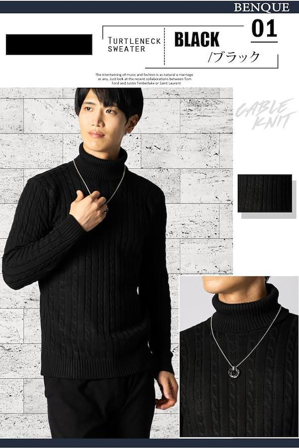 「上品さとスタイリッシュさを兼ね備えた」高いデザイン性とスリムなシルエットが特徴のケーブル編みニットタートルネックセーター。