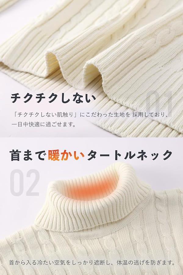 「首元まで温かく、お洒落に」首元を暖かく包み込むタートルネックと、リブ加工の袖口と裾が特徴。