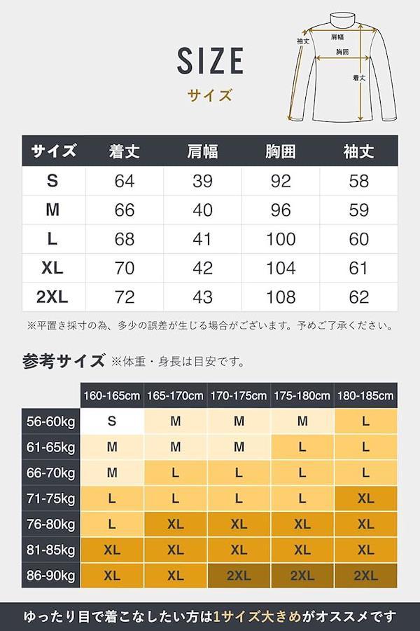 各サイズの寸法(着丈/肩幅/胸囲/袖丈)は以下の通りです:「S」64/39/92/58、「M」66/40/96/59、「L」68/41/100/60、「XL」70/42/104/61、「2XL」72/43/108/62。