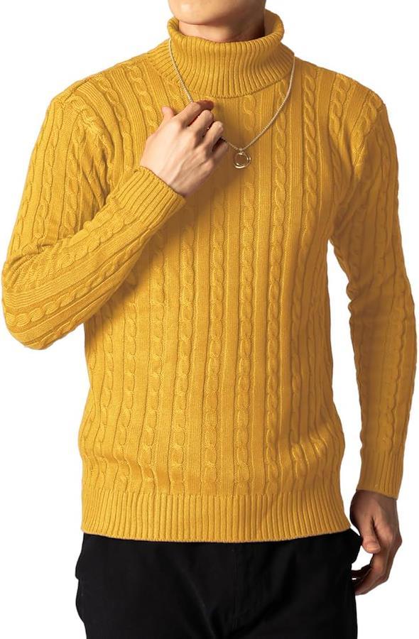 「上品さとスタイリッシュさを兼ね備えた」高いデザイン性とスリムなシルエットが特徴のケーブル編みニットタートルネックセーター。