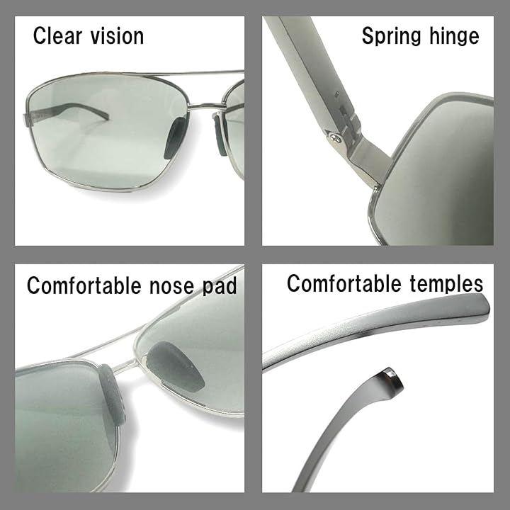 こちらのパイロットサングラスは偏光レンズと変色レンズの2つの働きで、乱反射のないクリアな視界を確保し、 レンズの自動変色で光の量を調節しながらUVフィルターにより有害な紫外線から目を守ります。