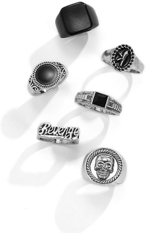 6点セットで楽しむ、クールなメンズリングコレクション。 ストリートファッションに映える、シルバー&ブラックのメンズリング6点セット。