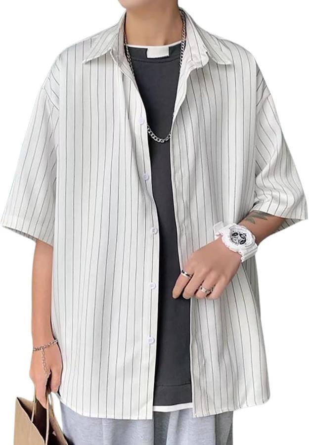 「ストライプ柄が映えるおしゃれな半袖シャツ」 スタイリッシュなストライプ柄が特徴のカジュアルシャツ。
