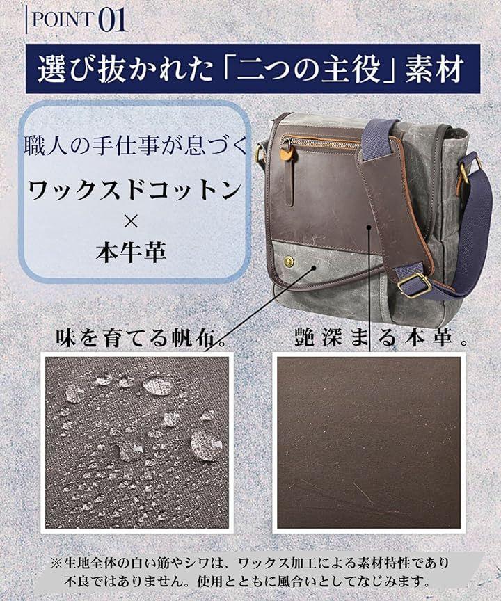 「本革xワックスドコットンの重厚感」高級本牛革と、撥水性のあるパラフィン加工帆布(ワックスドコットン)を贅沢に使用。