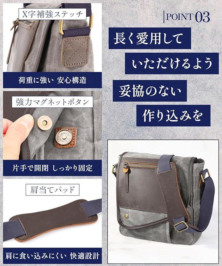 キャンプ・アウトドアでの身の回り品入れから、渓流釣りなどのアクティブなシーンまで、大人の趣味を支える多用途メンズショルダーです。