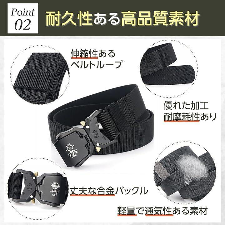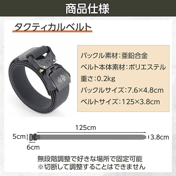 「サイズ:ベルト長さ125cm、幅3.8cm」このタクティカルベルトは、耐久性と快適性を兼ね備えた高性能設計。