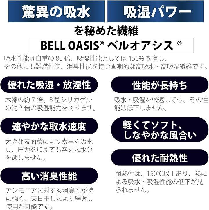 「機能性:高吸水・高吸湿繊維BELLOASIS」 防水布には日本製の高吸水・高吸湿繊維BELLOASISを採用しており、約30ccの液体を吸収。