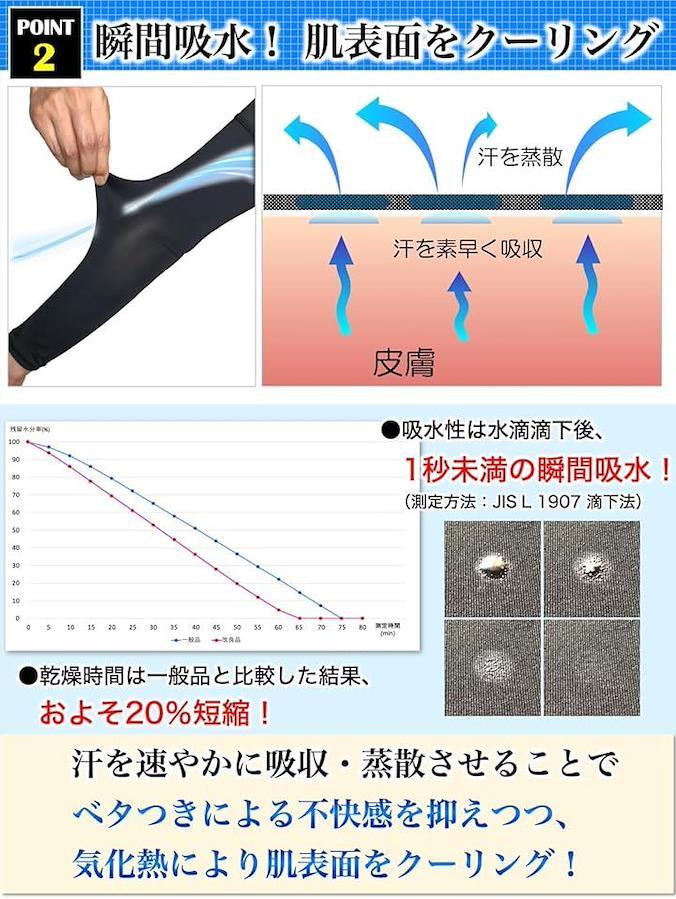 日焼けによるシミ、シワ、で吸汗速乾性に優れた生地により、素早く吸収した汗を蒸散させて気化熱により肌表面をクーリングさせます。