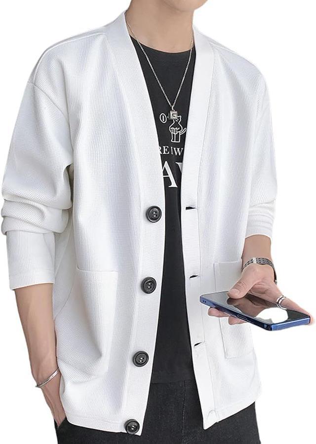 シンプルながらも洗練された印象を与える「ワッフル編みカーディガン メンズ」。