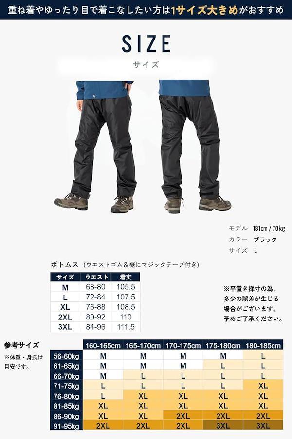 *用途:登山、釣り、バイク、自転車、通勤通学 *性能:耐水圧15000mm,透湿度10,000g/m2 *重さ:220g <レインパンツ> ウエスト /着丈 [M] : 68-80 / 105.5 [L] : 72-84 / 107.5 [XL] : 76-88 / 108.5 [2XL] : 80-92 / 110 [3XL] :84-96 / 111.5