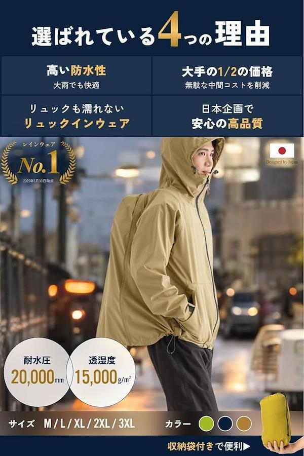 「大雨でも快適な耐水圧15,000mm・透湿5,000g/m2の高性能」 自転車やバイクでの運転を想定し、高い防水性とムレにくい透湿性を両立。