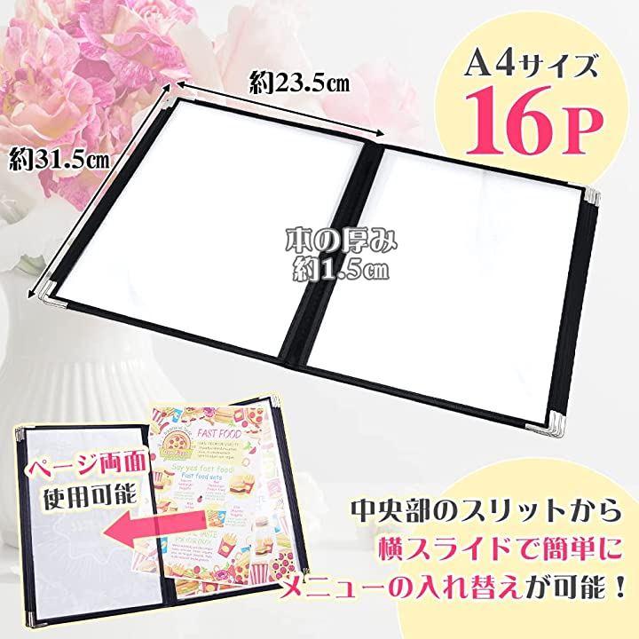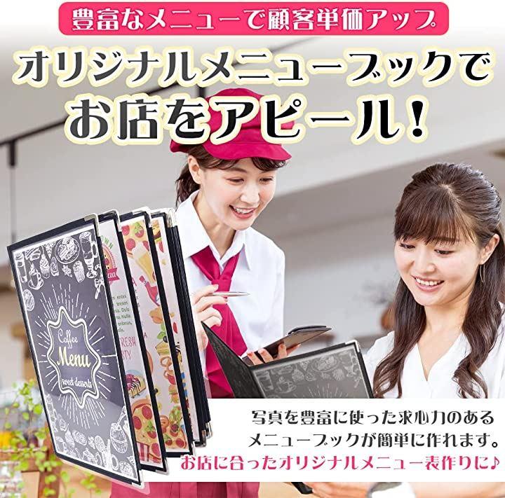 両面がクリアですので、中紙を背中合わせに入れて頂くと16面になり、食事から飲み物まで様々なメニューを載せることができます。