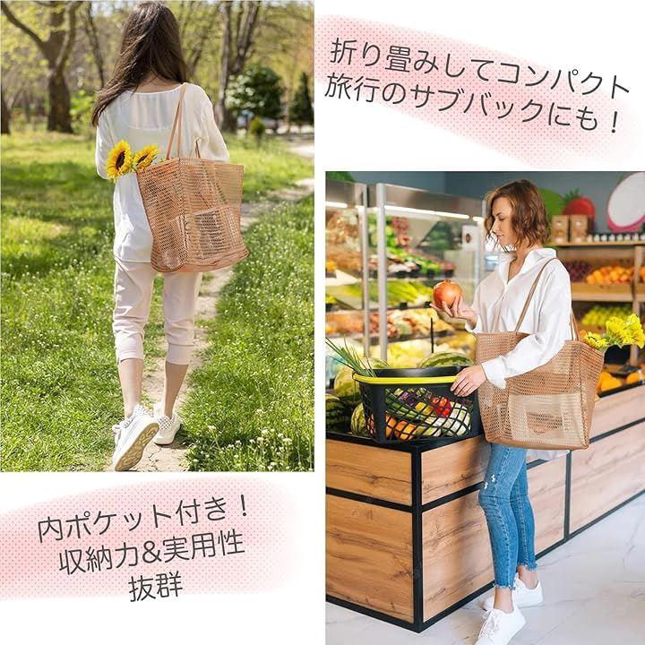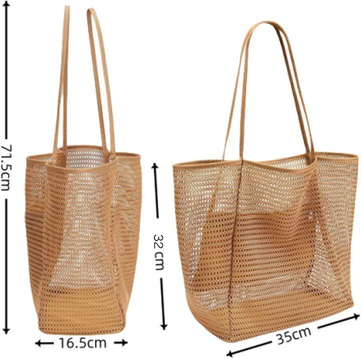 「仕様」 カラー:ブラック/ブラウン/オフホワイト サイズ:約35cm(幅)x39.5cm(高さ)x16.5cm(マチ) 重さ:約210g 素材:メッシュ(ポリエステル)/草編調デザイン 持ち手:ショルダー&手持ち両用 内部構造:内ポケット付き(ファスナータイプ)