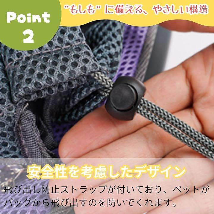 「安全性を考慮したデザイン」飛び出し防止ストラップが付いており、ペットがバッグから飛び出すのを防ぎます。