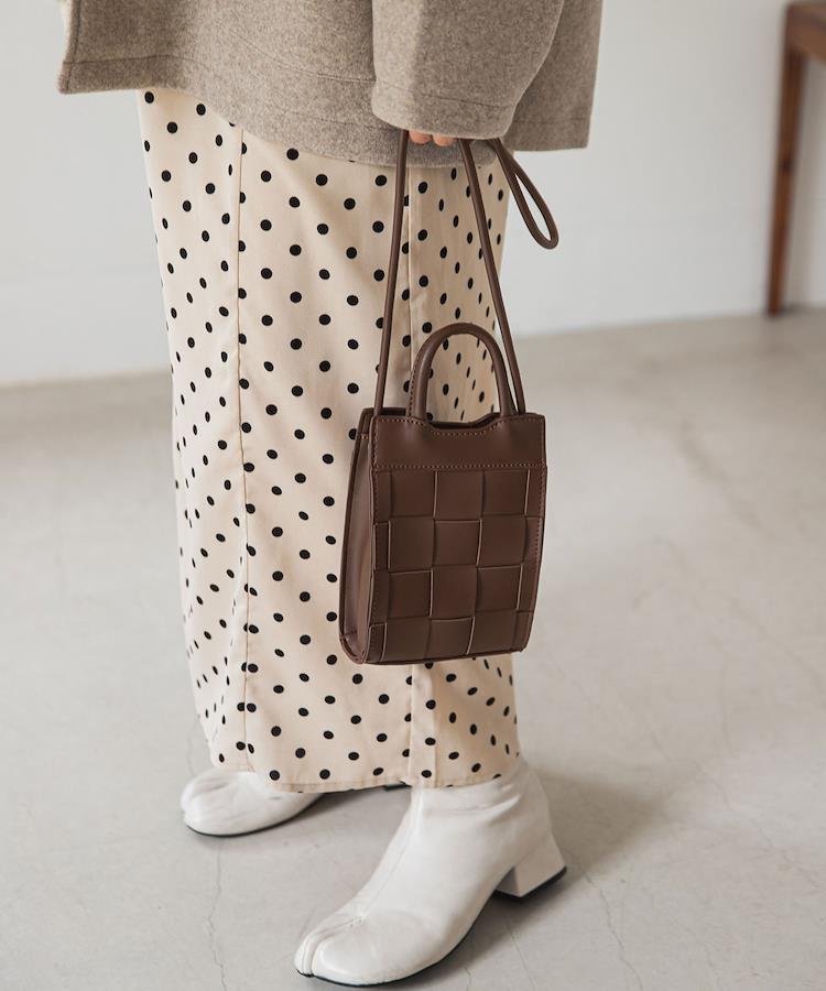 【ディティール】●フェイクレザーを編み込んだメッシュデザインは持つだけでコーデのアクセントに◎●紐の長さは内側の結び目で調節可能●内側にマグネット付きで収納時も安心●すっきりとしたワンハンドルデザイン●マチがあるので、スマホ、ミニ財布など見た目以上の収納力◎●カジュアル~フェミニンまで幅広いテイストにマッチ【素材】マットな質感が高見えするフェイクレザーを使用。【サイズ感】・2つ折りもしくはミニ財布・スマホ・化粧ポーチ(コンパクトやリップなど)などお出かけに必要なマストアイテムは収納可能。大きめバッグとの併用もおすすめです。《生産国》中国