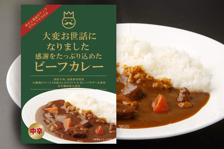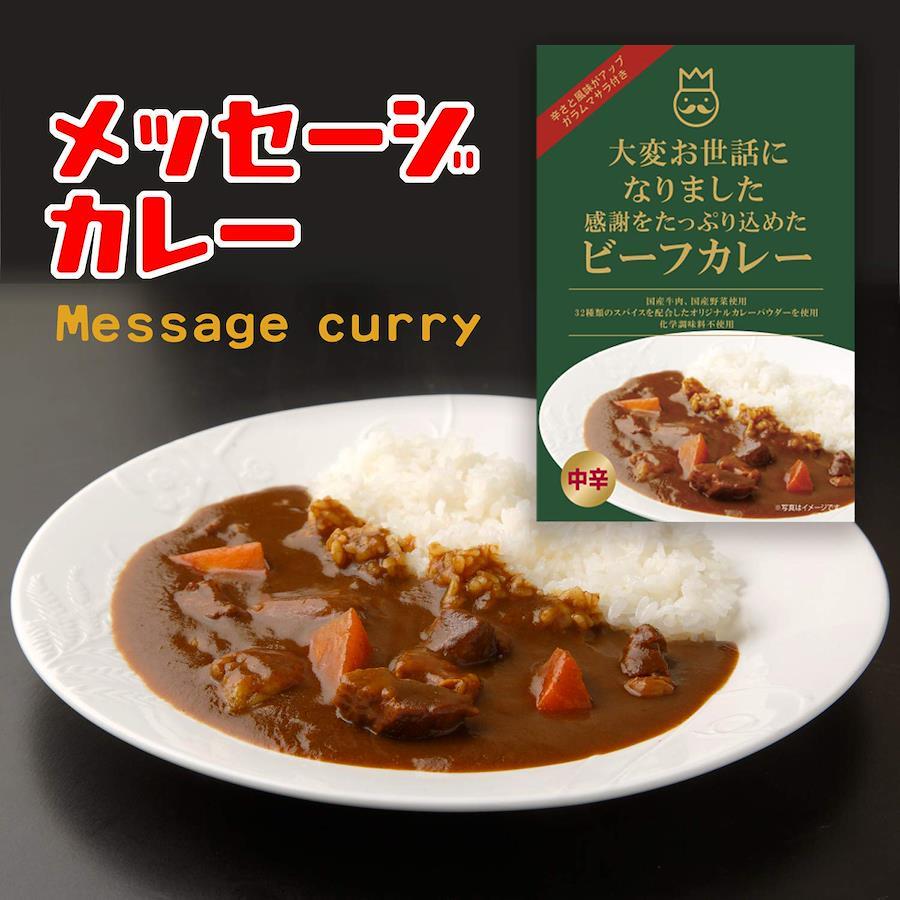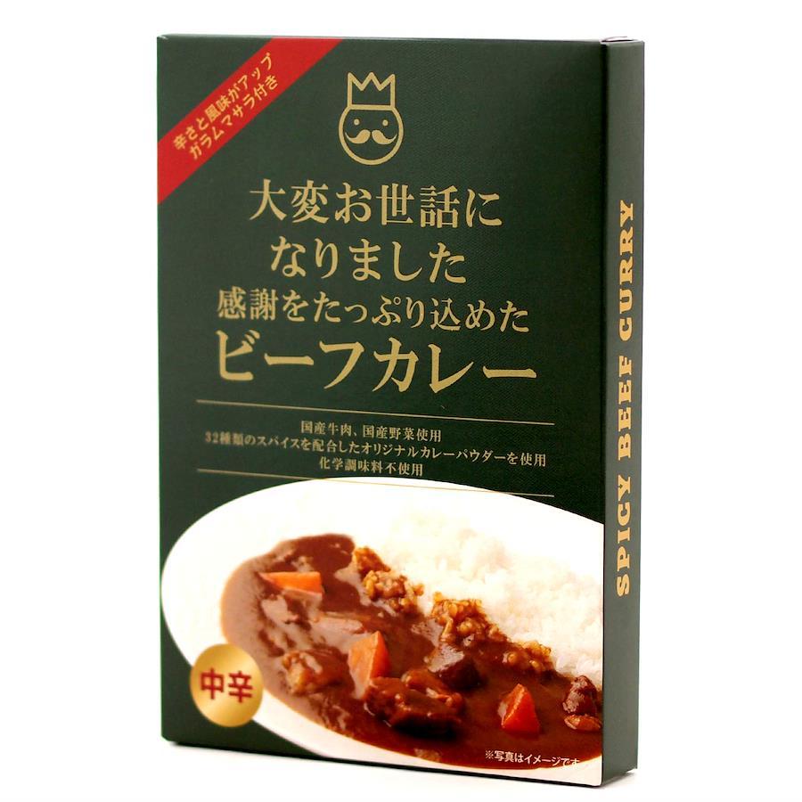 「大変お世話になりました」のメッセージが入ったパッケージのビーフカレー。価格は1人前(190g)×6個のお値段。1人前づつのちょっとしたギフトにおすすめです。※こちらの商品はギフト箱入りの仕様ではありません。ビーフカレーは32種類のスパイスを配合した本格的な深い味わい。国産牛肉とたっぷりの国産野菜を入れた、具だくさんのビーフカレーです。ガラムマサラは別添の袋に入っているので、お好みの辛さと風味に調整して、お召し上がりいただけます。ちょっとしたお礼には クッキーやスイーツなど甘いものが定番ですが、甘いものが苦手な方の場合、困りますよね。そんな時に是非、カレーのプチギフトをご利用ください。