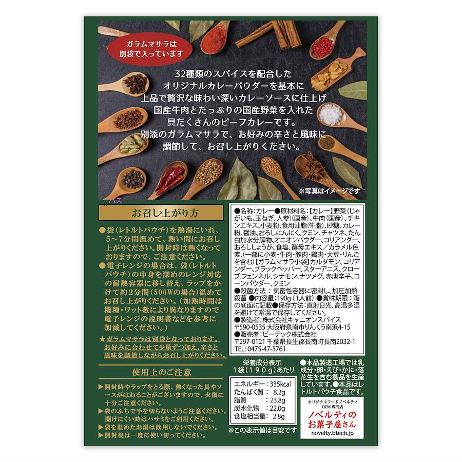【カレー】野菜(じゃがいも、玉ねぎ、人参)(国産)、牛肉(国産)、チキンエキス、小麦粉、食用油脂(牛脂)、砂糖、カレー粉、醤油、おろしにんにく、クミン、チャツネ、たん白加水分解物、オニオンパウダー、コリアンダー、おろししょうが、食塩、酵母エキス/カラメル色素、(一部に小麦・牛肉・豚肉・鶏肉・大豆・りんごを含む)【ガラムマサラ小袋】カルダモン、コリアンダー、ブラックペッパー、スターアニス、クローブ、フェンネル、シナモン、ナツメグ、赤唐辛子、コーンパウダー、クミン ○本品製造工場では乳・成分・卵・えび・かに・落花生を含む製品を生産しています。