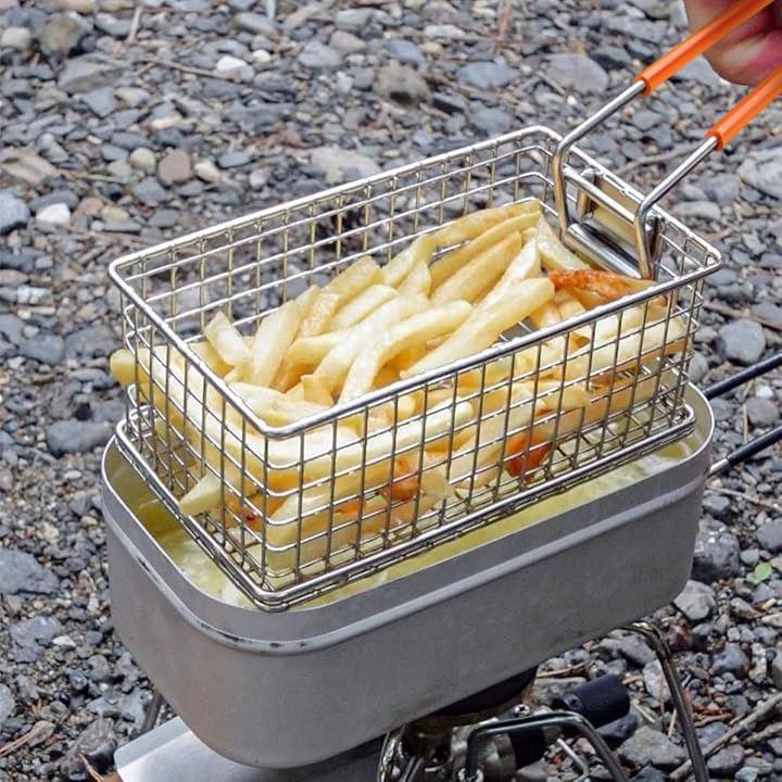 ・メスティンにぴったりのざる・湯切り、野菜洗い、フライヤーとして使える・焼きそばシートで蓋をするとポップコーンも作れる。