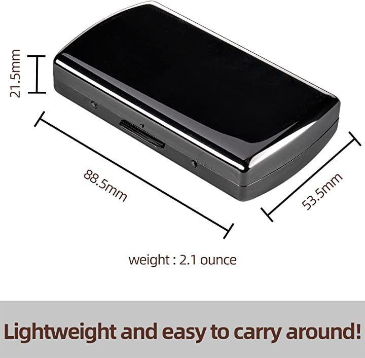 .たばこケースの寸法:88.5mm x 53.5mm x 21.5mm、重さはわずか2.1オンス、たばこケースの内側にはたばこを保持するための一対のスプリングクリップがあります
