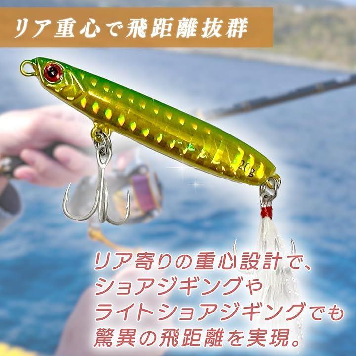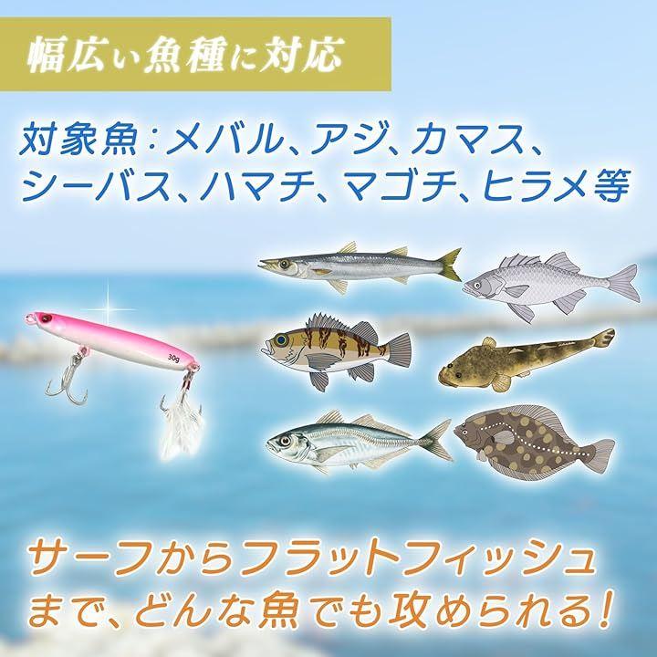 「幅広い魚種に対応」メバル、アジ、カマス、シーバス、ハマチからフラットフィッシュのヒラメやマゴチまで、このメタルジグで幅広い魚種をターゲットにでき、釣行のバリエーションが広がります。