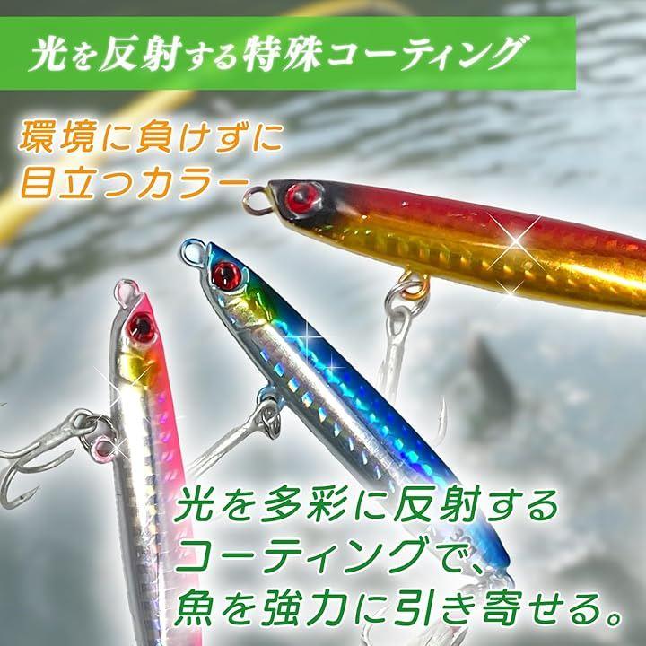 「光を反射するコーティングで魚を誘惑」 光を多彩に反射するコーティングを施し、魚を強力に引き寄せます。