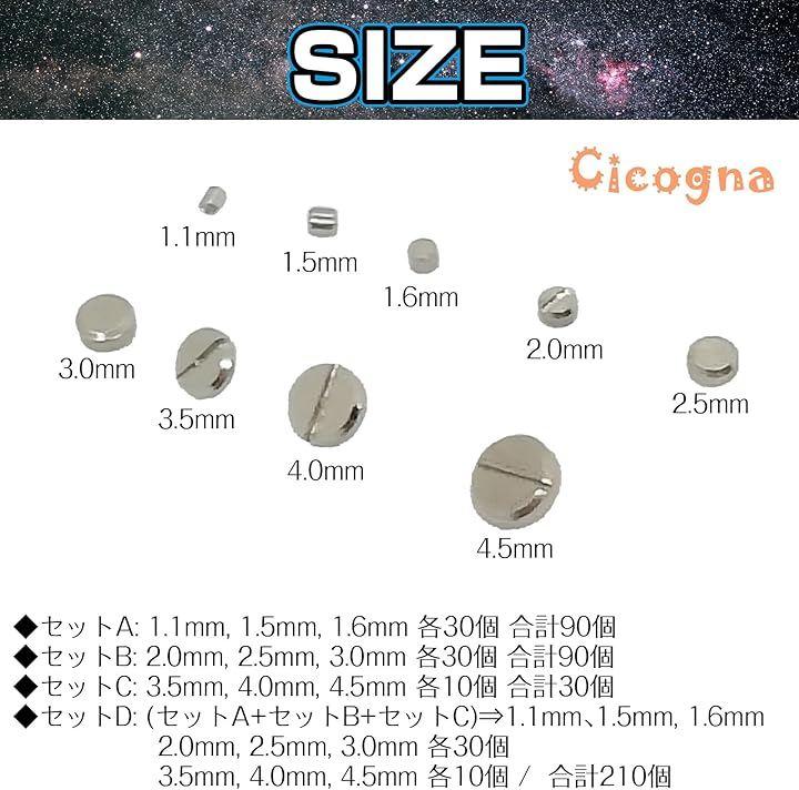 セット内容:セットA:1.1mm 1.5mm 1.6mm 30個入 (計90本入) セットB:2.0mm 3.5mm 4.5mm 合計30mm セット D:(30 mm) 1.1mm、1.5mm、1.6mm、2.0mm、2.5mm、3.0mm 各30個/3.5mm、4.0mm、4.5mm 各10個/合計210個