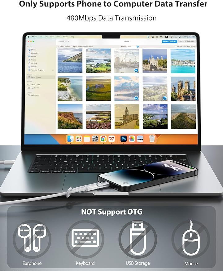 「高速データ転送」USB 2.0規格に準拠し、最大480Mbpsの速度でスマートフォンからパソコンへの写真や動画、ファイルの転送をサポート。