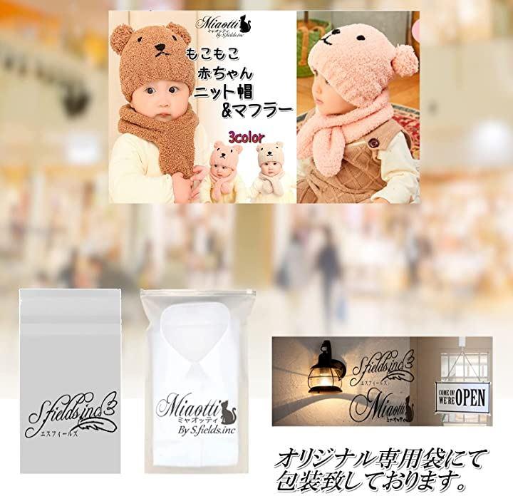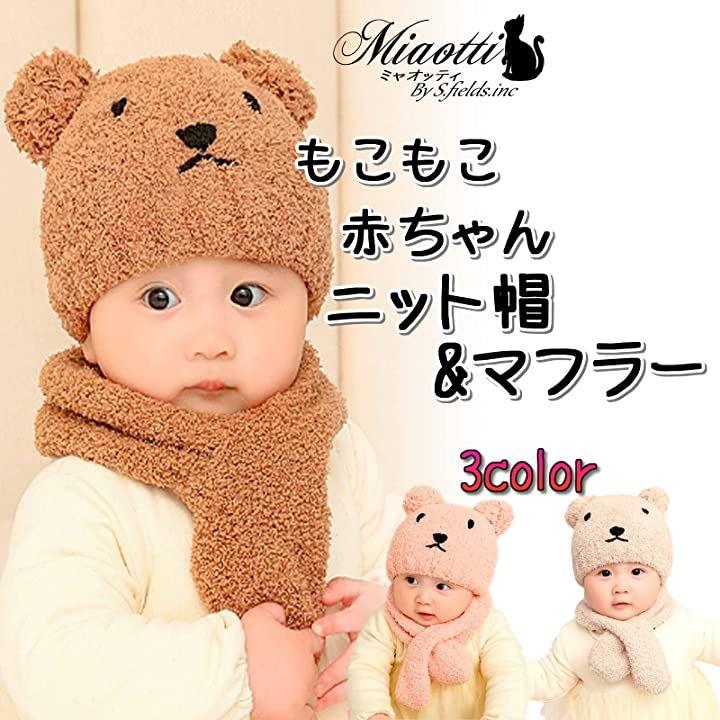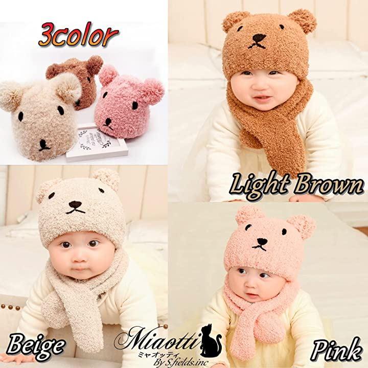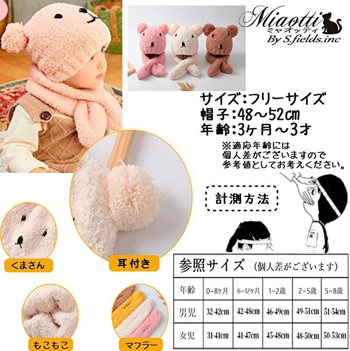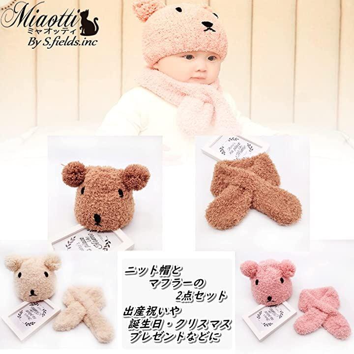 [ミャオッティ]ベビーニット帽子マフラー2点セットくま赤ちゃん新生児冬耳付き防寒対策0~2歳フリーサイズ