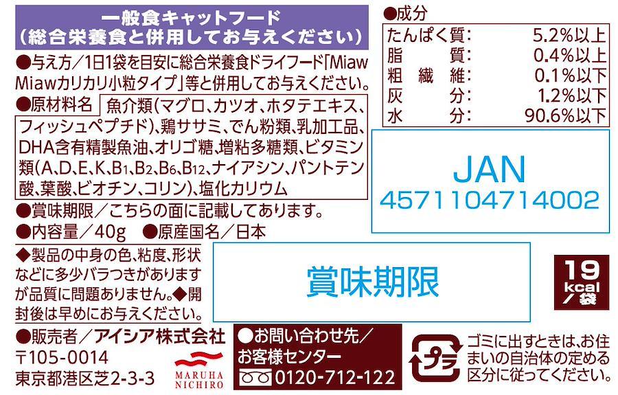 魚介類(マグロ、カツオ、ホタテエキス、フィッシュペプチド)、鶏ササミ、でん粉類、乳加工品、DHA含有精製魚油、オリゴ糖、増粘多糖類、ビタミン類(A、D、E、K、B1、B2、B6、B12、ナイアシン、パントテン酸、葉酸、ビオチン、コリン)、塩化カリウム