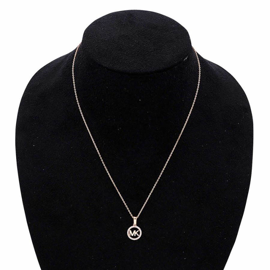 MKロゴをキュービックジルコニアでぐるりと囲ったローズゴールドのネックレスです。ジルコニアの輝きが顔周りを明るくしてくれます。