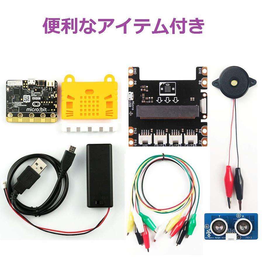 micro:bitは、イギリスの公共放送局BBCが中心となり、子どもたちがプログラミングを学ぶために作られたボードです。日本では200以上の小学校、世界でもアメリカ、カナダ、シンガポールなど40か国以上でSTEM教育教材として使用されています。※STEM教育とは… S:Science(化学)、T:Technology(技術)、E:Engineering(工学)、M:Mathematics(数学)の頭文字を合わせた言葉です。アメリカをはじめ、世界の教育シーンで"科学技術"を身につけることが重要視されており、STEM教育の重要性が日本でも高まってきています。カリキュラムに必要なパーツが付属していますので、何を学べばよいのかに迷い戸惑うことなく、購入後すぐに学ぶことができます。ロボット教育学の第一人者、川原田先生とSBC&S(株)が共同制作いたオリジナル学習教材冊子が同梱されています。「アドバンスセット」ではmicro:bitに搭載されているセンサーとパーツを組み合わせて、音を鳴らす楽器をつくったり、オリジナルロボットを作ったり、高いレベルの工作にチャレンジできます。 想像力次第でできることは無限大! すぐに学べるスペシャルパーツ8点と、わかりやすい学習教材付き。マイクロビット本体・本体ケース・Micro USBケーブル・電池ボックス・学習教材・拡張用コネクタ(GROVEシールド)・超音波センサー・スピーカー・ワニ口クリップ(より) パッケージサイズ :幅26.00cm×高さ4.5cm×奥行18.8cm 子どもたちがプログラミングを学ぶために作られた小型のコンピュータボードです。 インターネットに接続したパソコンでプログラミングを行い、できたプログラムをmicro:bitに転送して作業を実行させます。 Microsoft提供のMakeCodeエディターを使えば、ブロックまたはJavaScriptを使ってmicro:bitを簡単にプログラムできます。 ブロック型のプログラミング言語を使うので、はじめてプログラミングする人でも簡単に取り組めます。