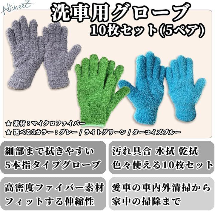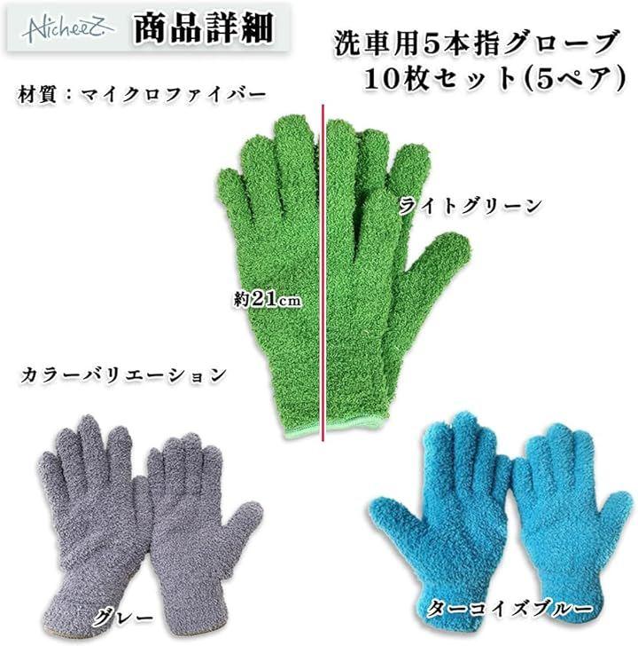 「商品内容」 洗車用5本指グローブ10枚セット(5ペア) 材質:マイクロファイバー カラー:グレー/ライトグリーン/ターコイズブルー サイズ:長さ/約21cm