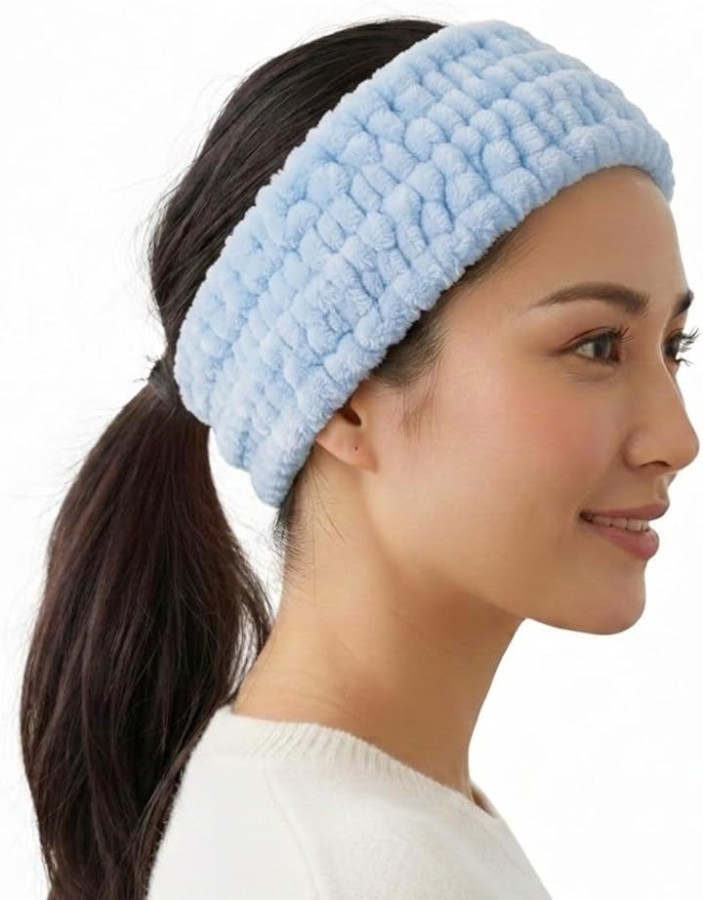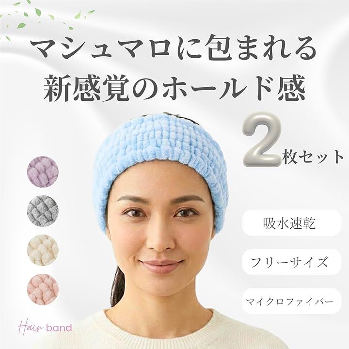 「洗顔・スキンケア・お風呂上がりに」高吸水マイクロファイバー素材のヘアバンドで、洗顔・クレンジング・スキンケア・お風呂上がりの髪の水分ケアをサポートします。