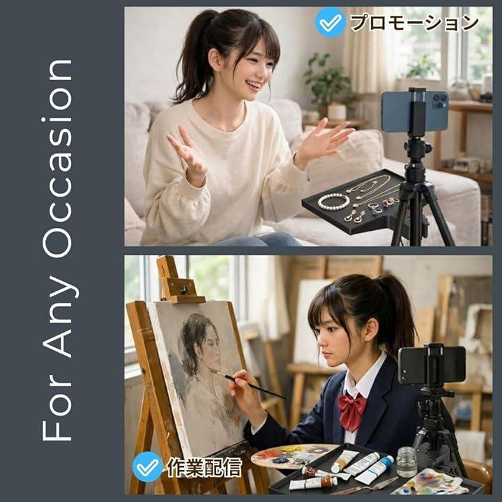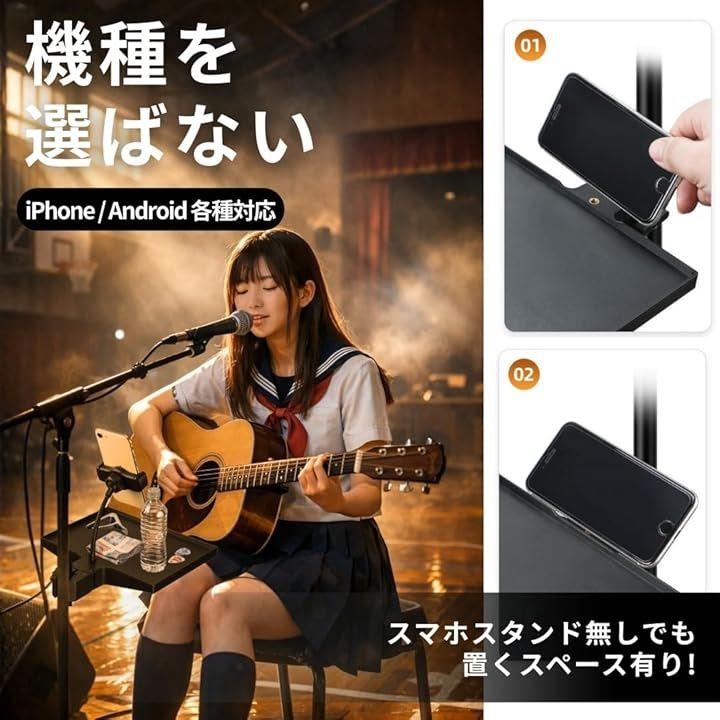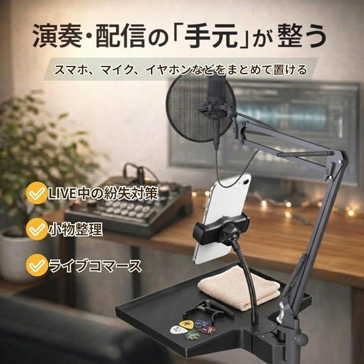 「広々トレイ」演奏や配信で使用するスマホ、マイク、イヤホン、カポやピックなどの小道具を手元に置け、パフォーマンスのスムーズな進行を後押しします。