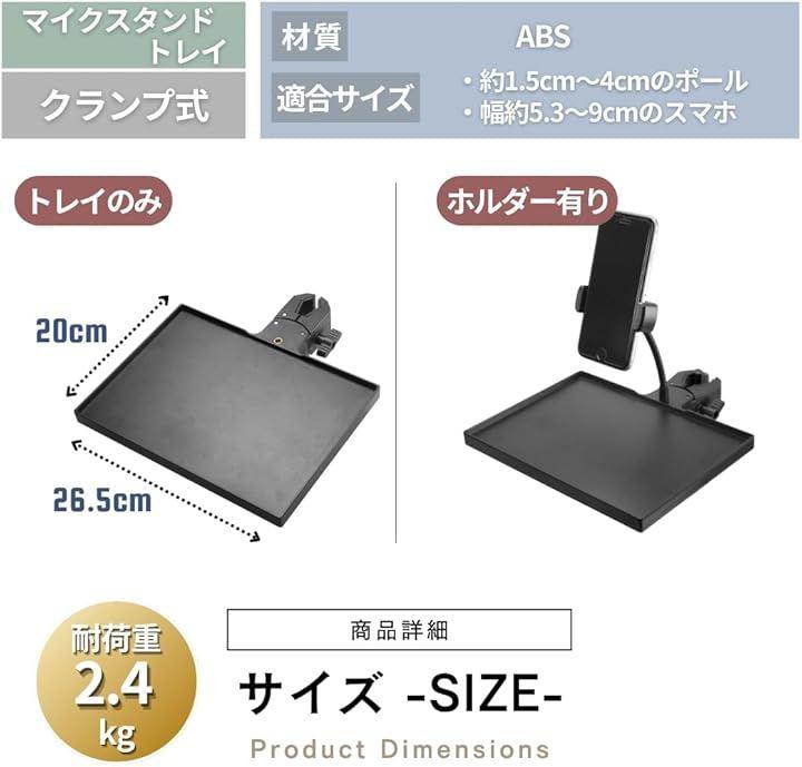 「商品内容」サイズ(約): 26.5x20cm 適合サイズ(約):1.5cm~4cmのポール、横幅5.3~9cmのスマートフォン(iPhone 17 proMAX可) 耐荷重(約):2.4kg 主な材質:ABS *サイズ詳細は商品画像をご確認ください。