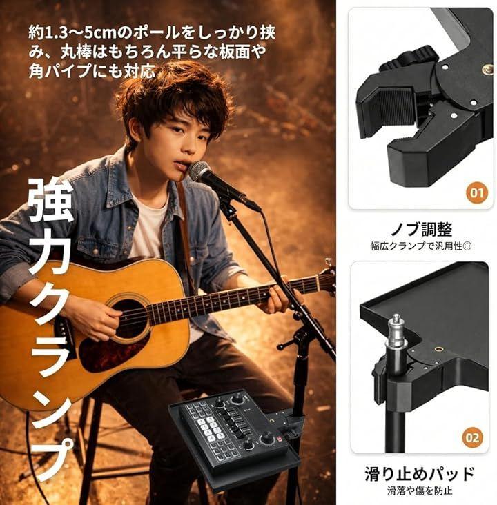 ノブを回して固定でき、マイクスタンドや譜面台、ノートPCスタンドなどのポールに素早く装着が可能。