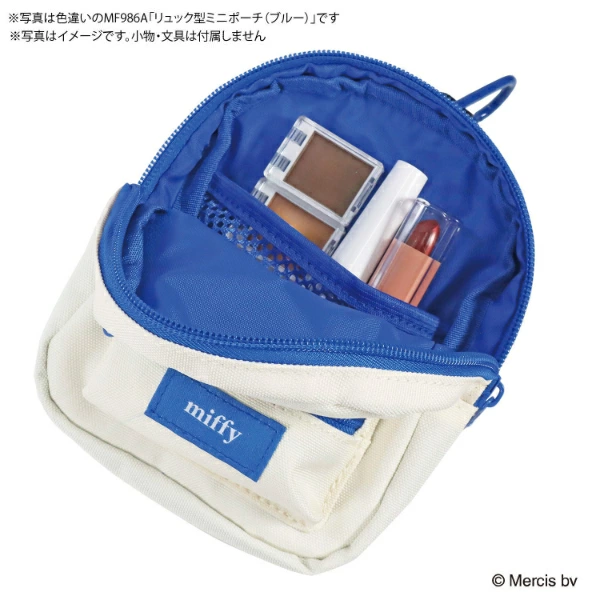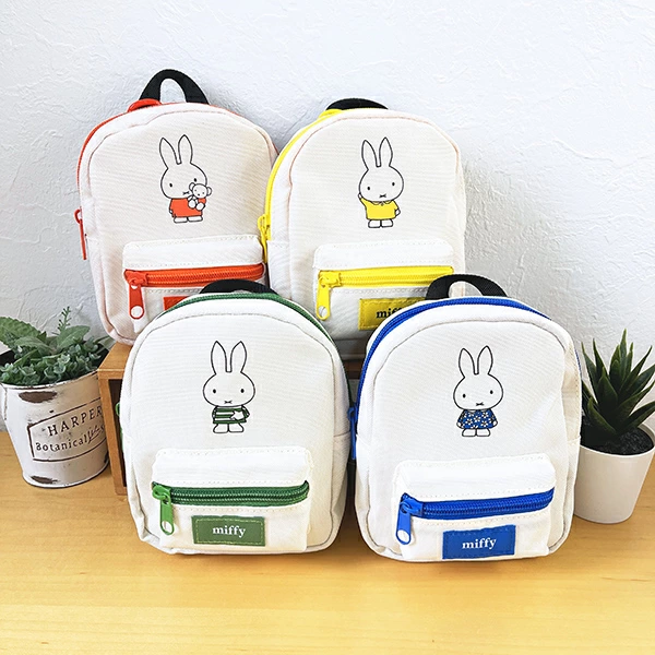 ブルーナカラーシリーズのリュック型ミニポーチです♪アイボリーベースにさりげないブルーナカラー仕様が大人でも使いやすいポイント!同シリーズで他アイテムたくさんあるので、揃えたくなっちゃう♪内側にメッシュポケット付き!小物入れにピッタリなサイズ♪裏面にバンドが付いているので、お気に入りのぬいぐるみにも付けれますよ☆彡
