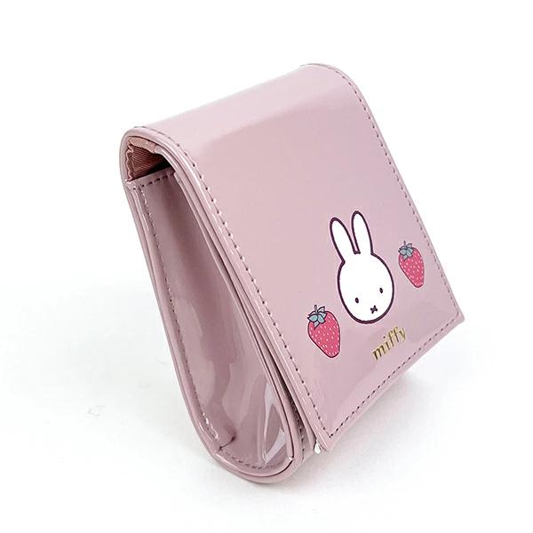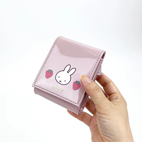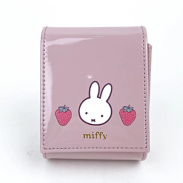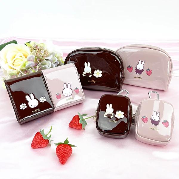 ミッフィーといちごのデザインのリップポーチです。エナメルの光沢感がおしゃれで、内生地には外の色に合わせた色合いのデザイン生地を使用。カバー部分を開けると内側にミラーが付いているので、ちょっとしたメイク直しなどにとても便利ですね♪標準サイズのリップが3本収納可能。コンパクトなサイズでカバンにも収納しやすく、小物入れにも最適です。色違いもございますのでチェックしてみてくださいね☆