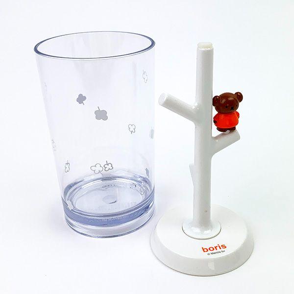 ボリスフィギュア付きのスタンドに、コップが付属。使い終わったらスタンドで乾燥。飲み口がどこにも触れずにに衛生的にお使いいただけます。