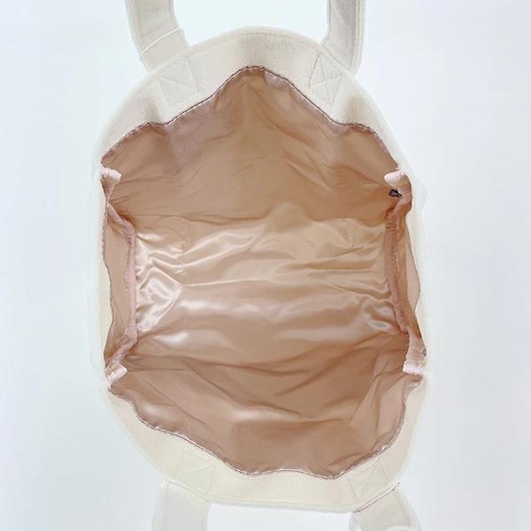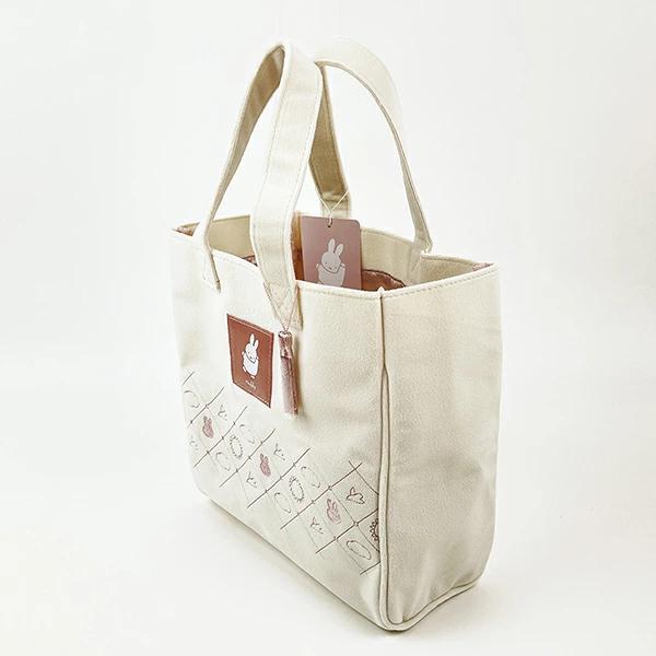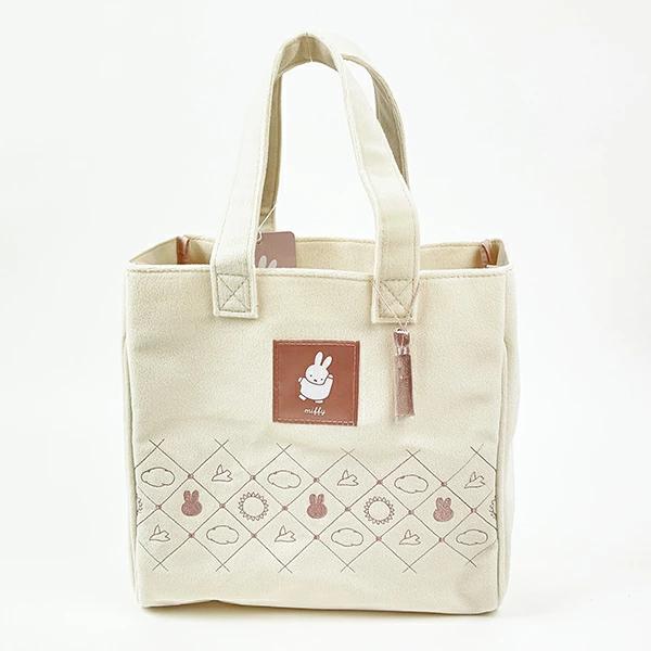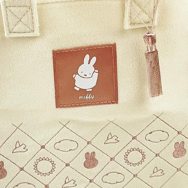 ミッフィーのナイトアンドデイシリーズのトートバッグです。ランチにも使える大きさ!手触りのいいベロア生地でかわいい♪刺繍とシンプルなタグデザインがキュート♪取っ手にタッセルが付いていて高級感があります☆