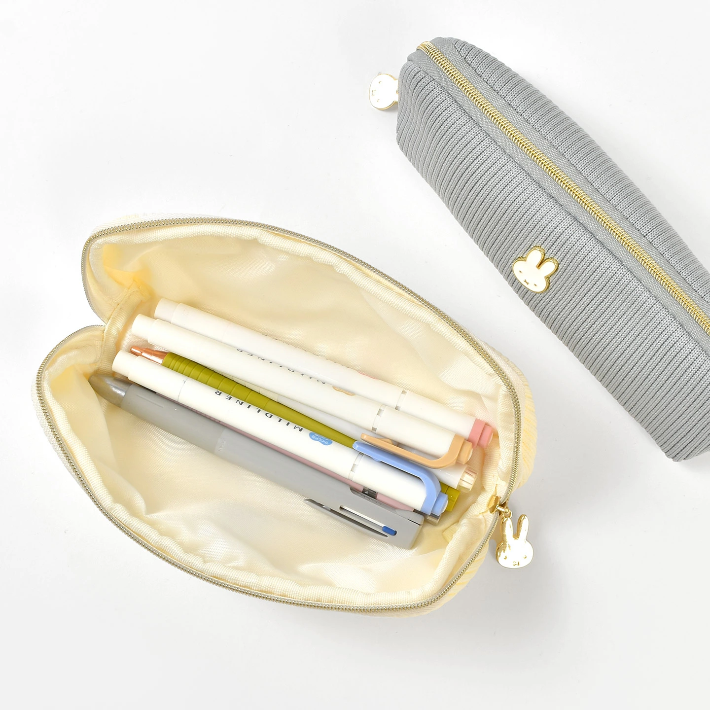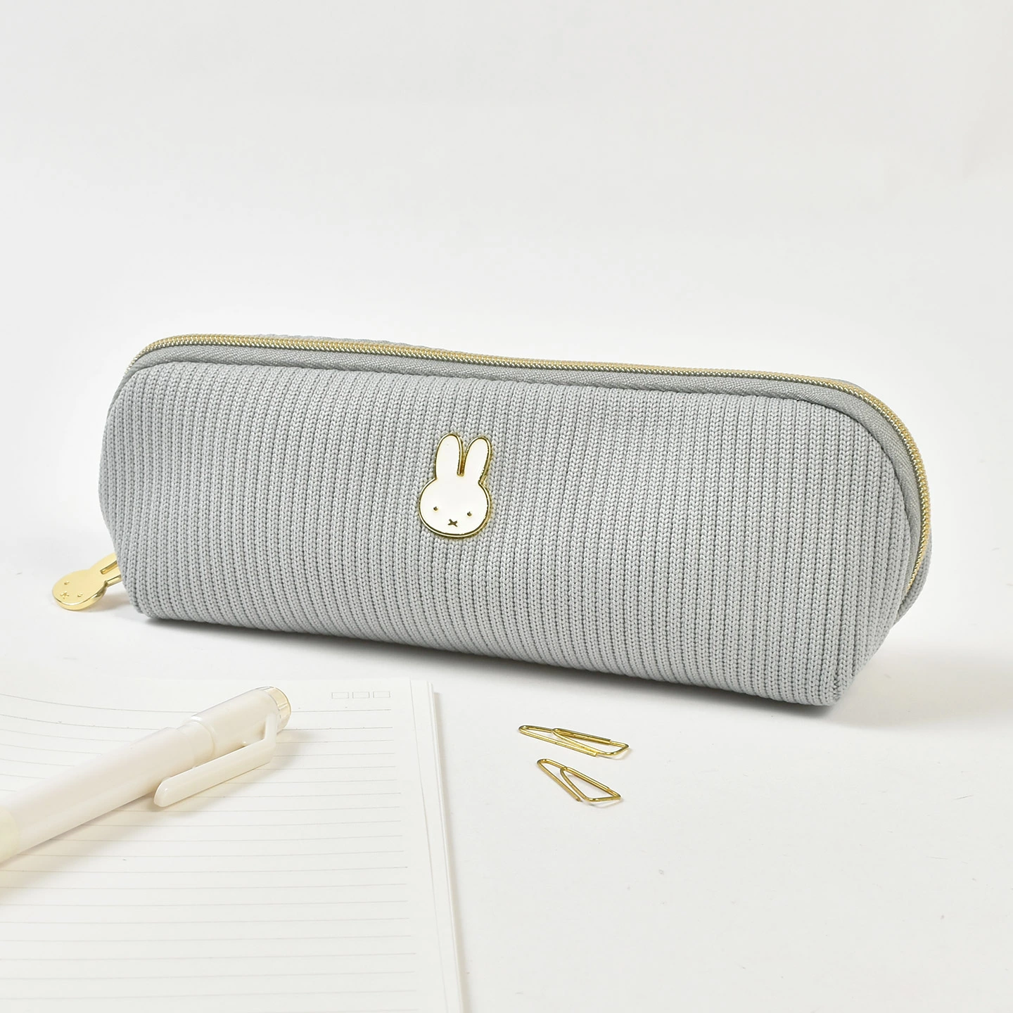 【ペンケース】ミッフィーのチャームがワンポイントのペンケース。ニット風の生地とさりげないミッフィーの装飾が大人可愛い♪ファスナータイプで開口部が大きく開くので、ペンが出し入れしやすく、コスメや小物ポーチとしても活躍します。