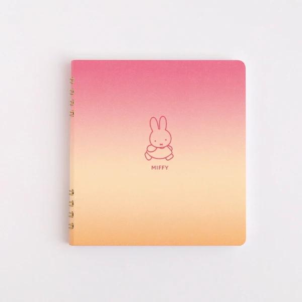 グラデーションとミッフィーのイラストをシンプルに組み合わせたシリーズでほんのり透け感がある、マットな質感の、温かみのある手触りな素材にもこだわった大人の方に是非お使いいただきたいシリーズです♪こちらのスクエアタイプのリングノートは表紙に風合いのある素材を使い、手触りの良さにもこだわったリングノートです☆