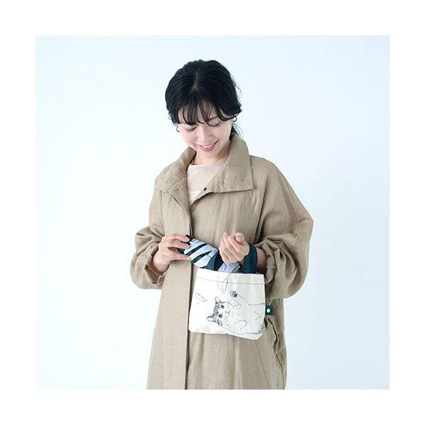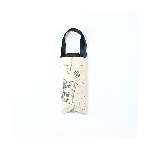 共袋は雨傘の吸水バッグ付きミニ傘とおそろいのねこじゃらしで遊んでくださる(笑)トラ猫さんをプリントした、きちんとたたまないでもサッと入れられるトートバッグタイプ。