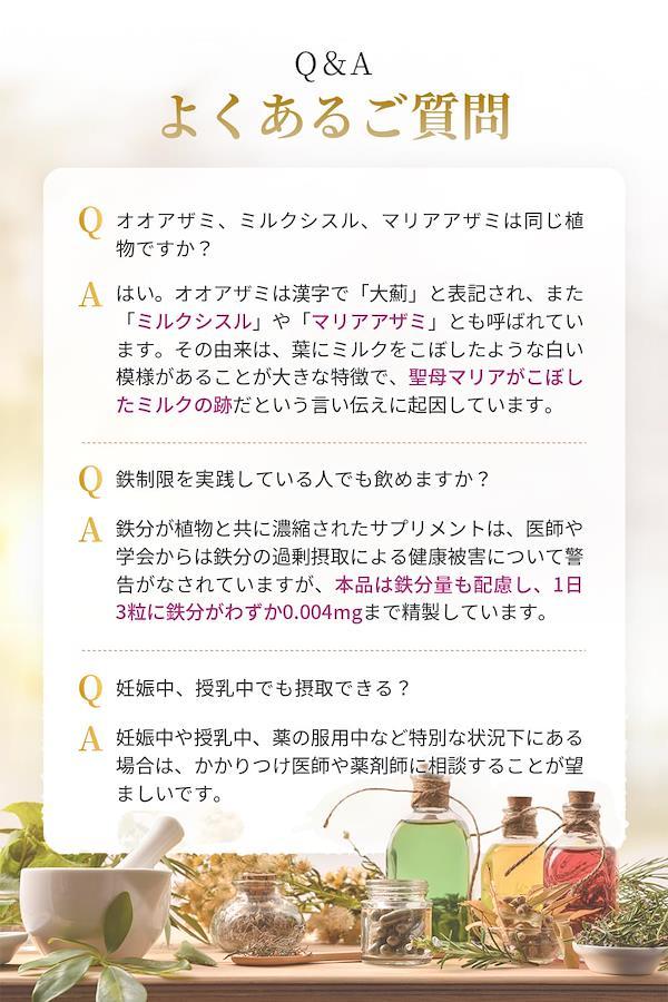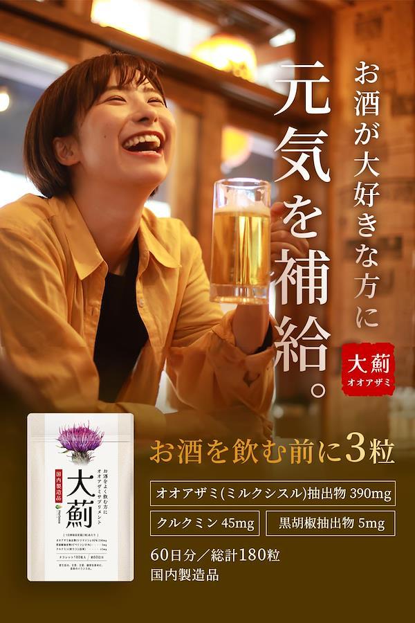 ■サイズ:??19x12x1cm;70g オオアザミ(別名:ミルクシスル)は、ヨーロッパで2000年以上前から、お酒を飲む人々の健康維持をサポートするためのハーブとして利用されてきました。 【ミルクシスル高配合】1日3粒あたり、シリマリン80%以上含有するオオアザミ(別名:ミルクシスル)抽出物390mgを贅沢に配合。※1袋(60日分)あたりオオアザミ抽出物23400mg(シリマリンとして18720mg)を含有。 【ダブルサポート成分】日本ではお酒のお供として知られるクルクミン(秋ウコン由来)と、成分吸収率をサポートするピペリン(黒胡椒由来)も配合しており、お酒を楽しむ方々の健康的でパワフルな毎日をサポートします。 【国内製造】創業50年以上の富山県GMP認定工場で製造。国内第三者機関を通じて放射性物質や残留農薬の数百種類も分析し、厳選した植物原料を使用(残留農薬全307項目全て不検出/分析機関:日本食品機能分析研究所) 【原材料名】乳糖、オオアザミ(ミルクシスル)抽出物、黒胡椒抽出物/セルロース、クルクミン、HPC(食物繊維)、ショ糖脂肪酸エステル、微粒酸化ケイ素 【内容量】180粒(60日分) 【1日3粒あたりの健康成分】ミルクシスル(オオアザミ)抽出物:390mg(シリマリン≧80%)、クルクミン45mg、黒胡椒抽出物(ピペリン95%)5mg ■重要なお知らせ原材料・成分1日3粒あたりの成分量:オオアザミ抽出物(別名:ミルクシスル、マリアアザミ、大薊)390mg(シリマリンとして312mg)、クルクミン(秋ウコン由来)45mg、黒胡椒抽出物(ピペリン≧95%)5mg