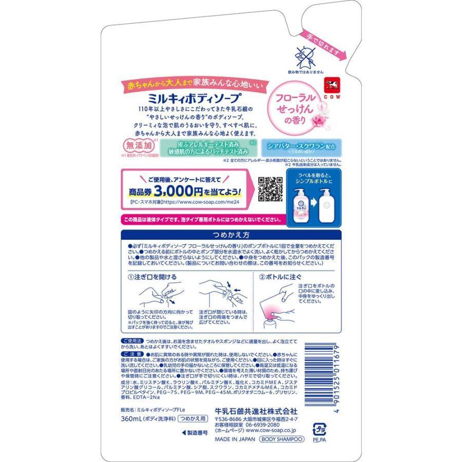 【つめかえ方】・必ず「ミルキィボディソープフローラルせっけんの香り」のポンプボトルに1回で全量をつめかえてください。・つめかえる前にはボトルの中とポンプ部分を水道水でよく洗い、よく乾かしてからつめかえてください。・他の製品や水と混ざらないようにしてください。・中身をつめかえた後、パックの製造番号を記録しておいてください。(1)注ぎ口を開ける:パッケージの矢印の方向に向かって切り取ってください。注ぎ口が閉じているときは、注ぎ口の両端をつまんで広げてください。(2)ボトルに注ぐ:注ぎ口をボトルの口の中に差し込み、中身をゆっくり出してください。